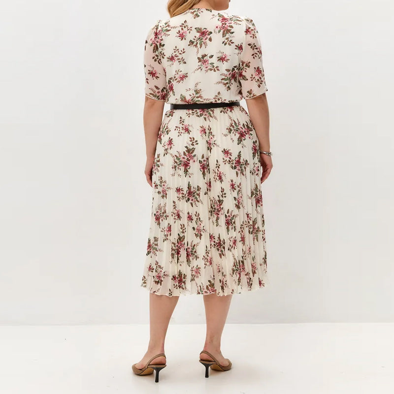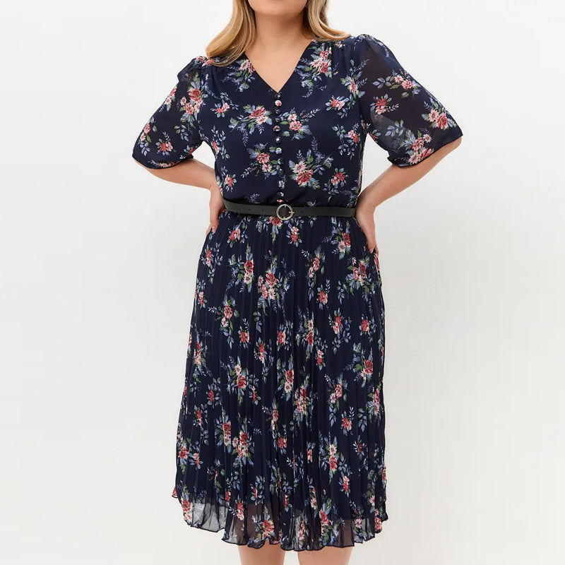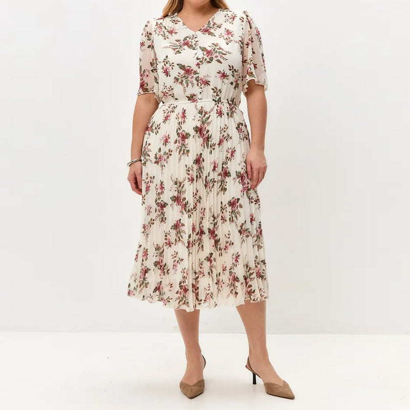 A csomag tartalmaz 1 x elegáns virágos pliszírozott ruhát.