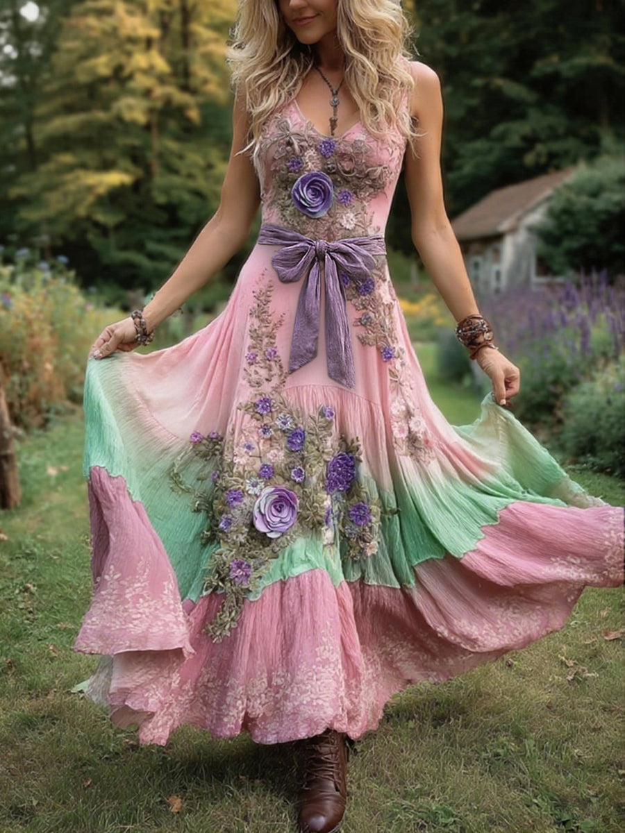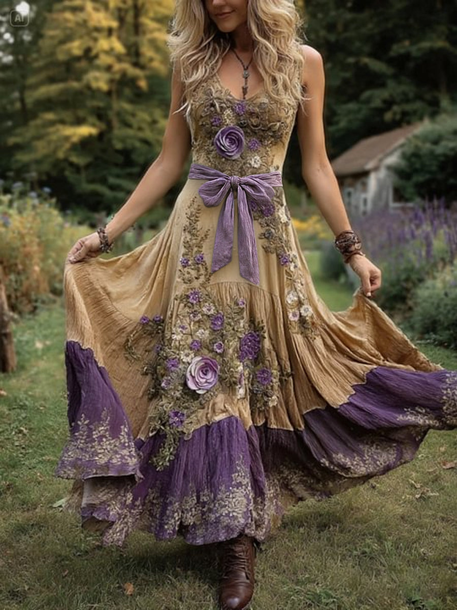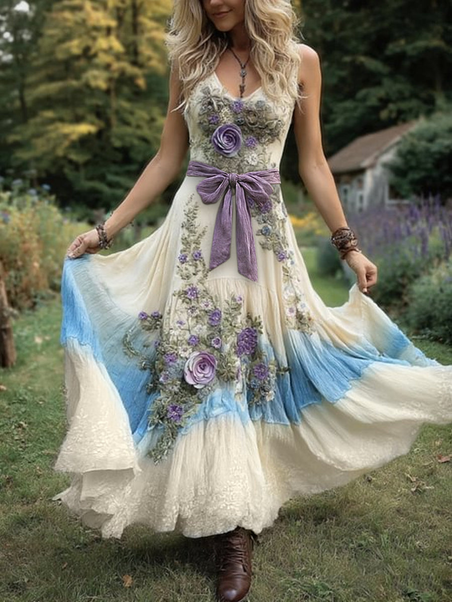 Retro vidéki virágművészet nyomtatott vintage v-nyak ujjatlan kényelmes maxi ruha