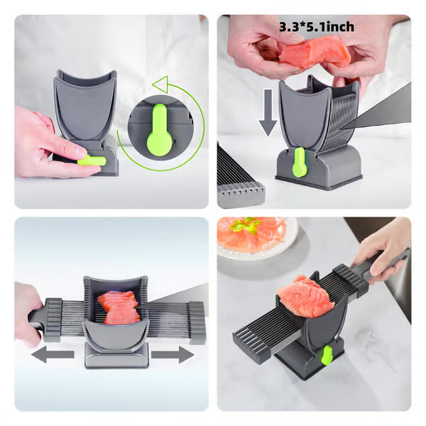 ÁLLÍTHATÓ VASTAGSÁG: Ez a kézi hússzeletelő a friss húshoz 2 késkészlettel rendelkezik, élvezze a rugalmasságot, hogy 2 mm-es vagy 4 mm-es hússzeleteket vágjon, tegye vissza a hússzeleteket a tartályba, vágja le újra, hogy húscsíkokat, kockákat kapjon, élvezze a finom ételeket könnyedén, mint például a forró edény, a fekete borsos marhahús, a lazac sushi.