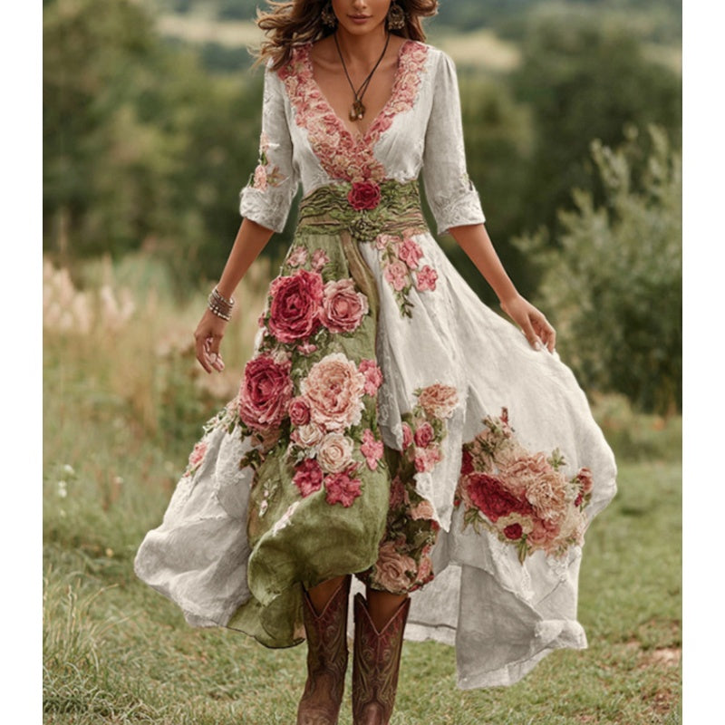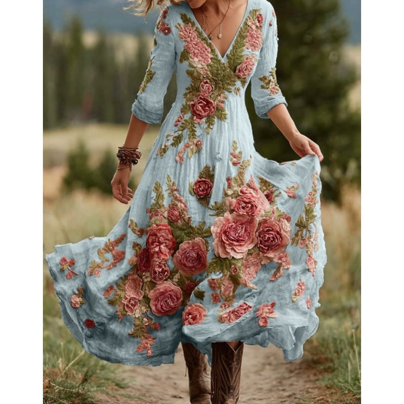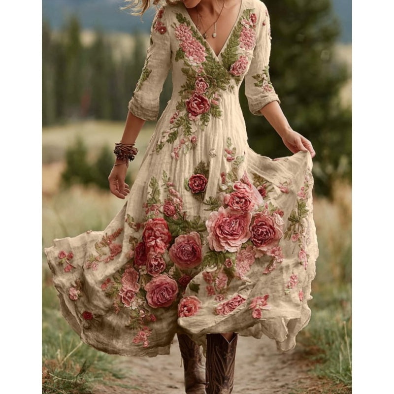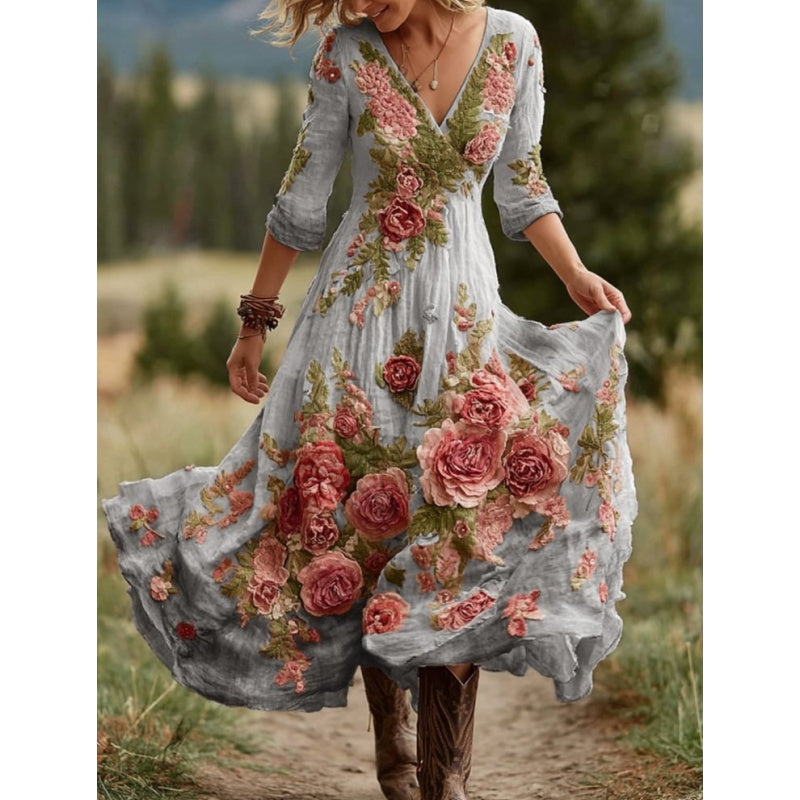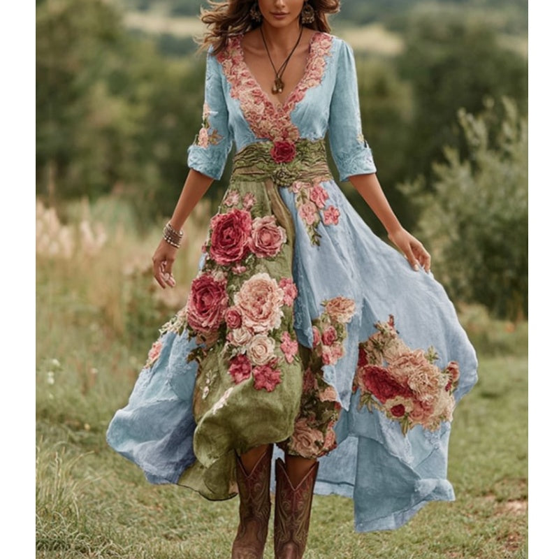 BOHÉM INSPIRÁCIÓS TERVEZÉS – Ez a ruha egy lebegő, széles szoknyával és bohém stílusú virágmintával rendelkezik, ami egy időtlen és szabad szellemű megjelenést kölcsönöz neki. A légies szabás könnyű mozgást tesz lehetővé, így tökéletes meleg időben, nyaraláskor vagy alkalmi összejöveteleken. Könnyed varázsa egy laza életmódot tükröz, miközben stílusos marad.
