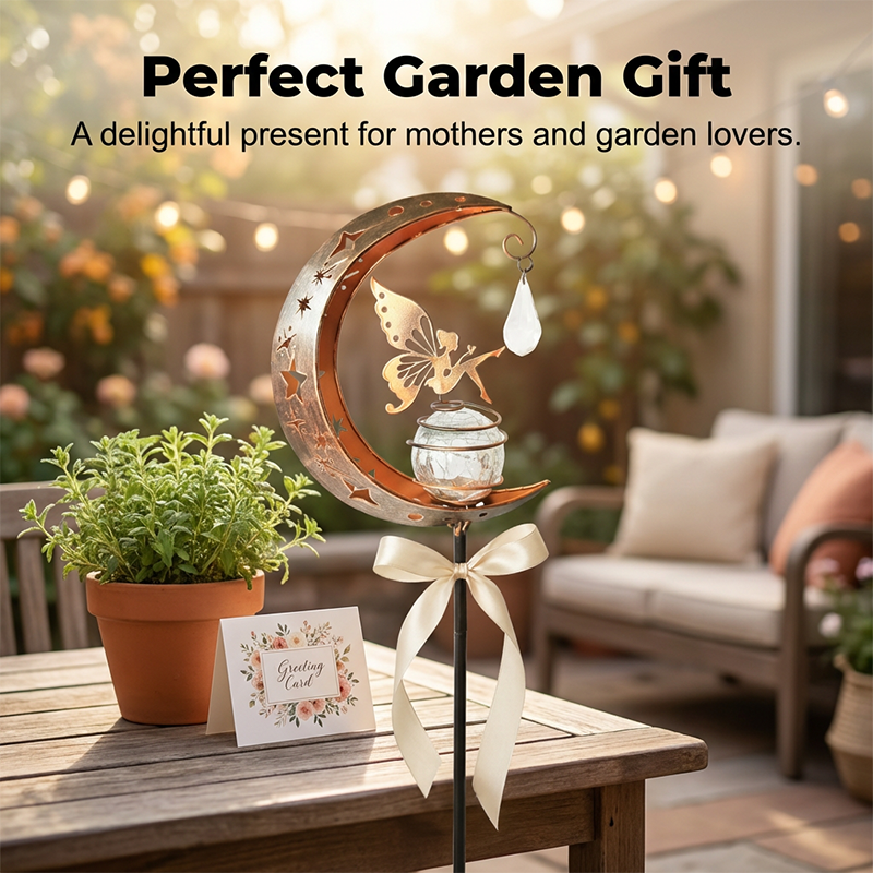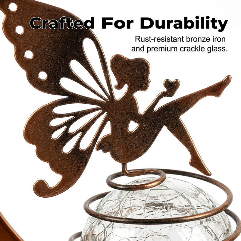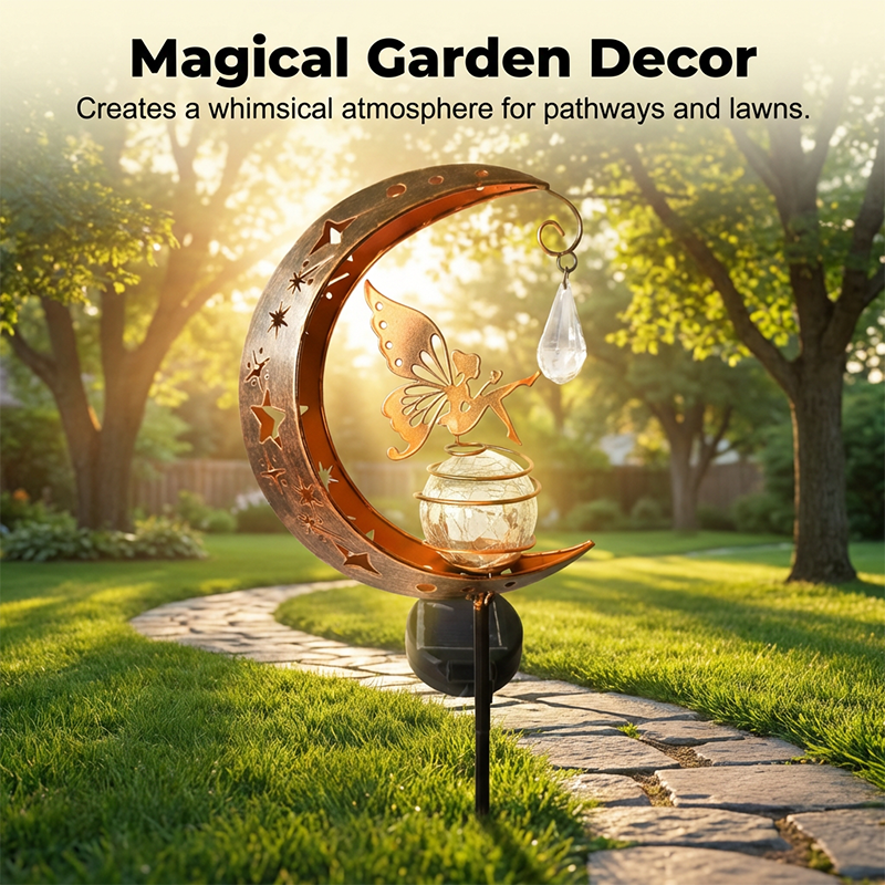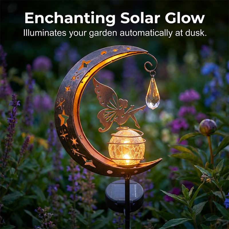 VARÁZSLATOS TÜNDÉR ÉS HOLD DESIGN - Adjon egy kis varázslatot a kertjéhez. Ez az egyedülálló lámpa egy finom tündérrel díszített, repedezett üveggömböt ábrázol, amelyet egy félhold keretez, így egy mesés, mesekönyvből kilépett hangulatot teremt.