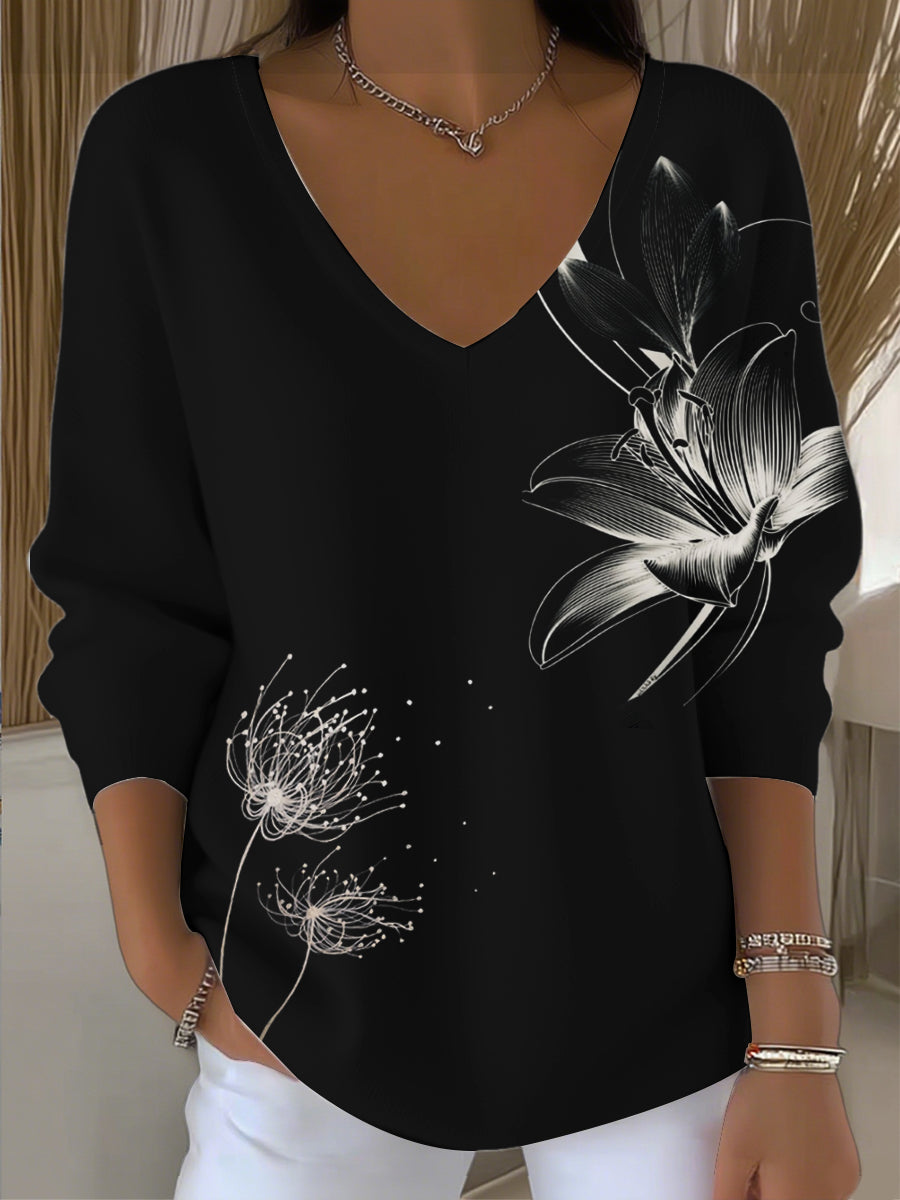 Női egyszerű és elegáns virágos hímzés fekete v-nyak pulóver