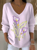 Női egyszerű és szép patkó virág hímzés világos lila v-nyak virág hímzés pulóver