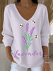 Női levendula virágos hímzés világos lila v-nyak pulóver