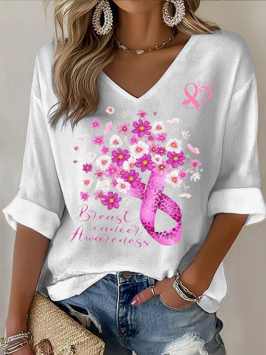 Női olíva mellrák szalag nyomtatott v-nyak hosszú ujjú