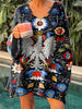 Női vintage etnikai virágmintás alkalmi V-nyakú pulóver