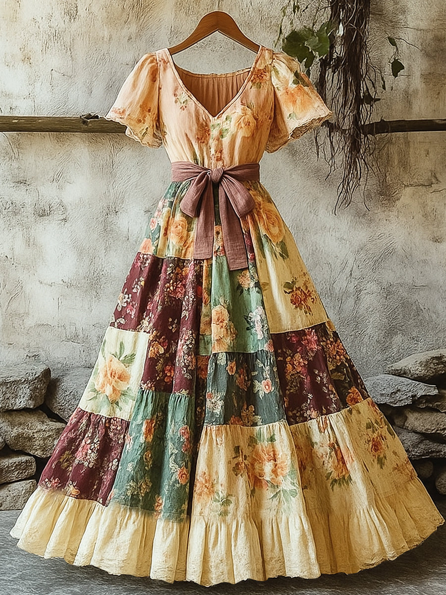 Női retro vidéki virágos patchwork nyomtatott v-nyak rövid ujjú pamut maxi ruha