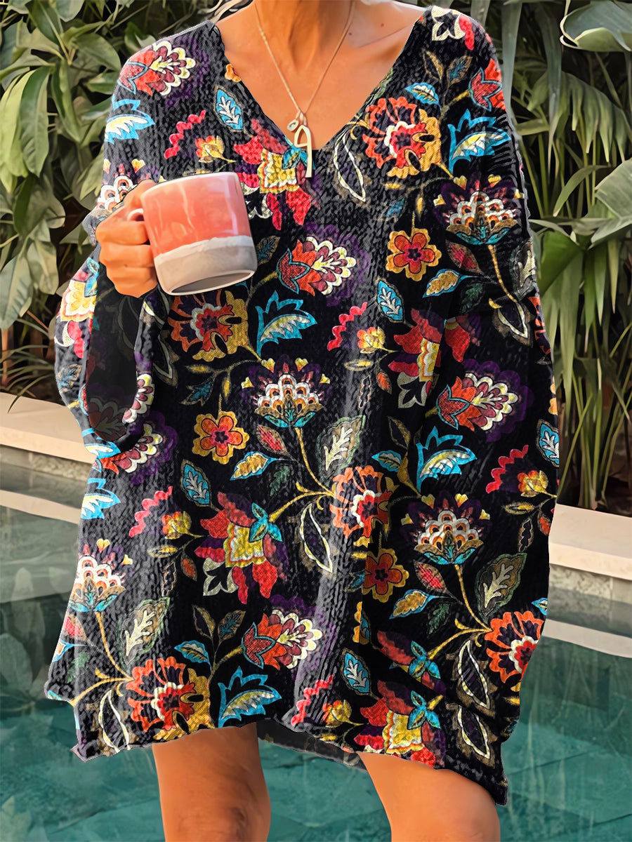 Női vintage népi virágos művészet v-nyak pulóver