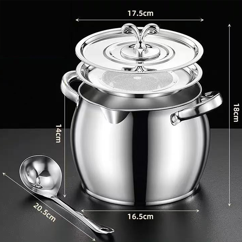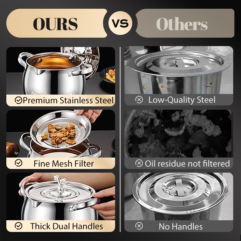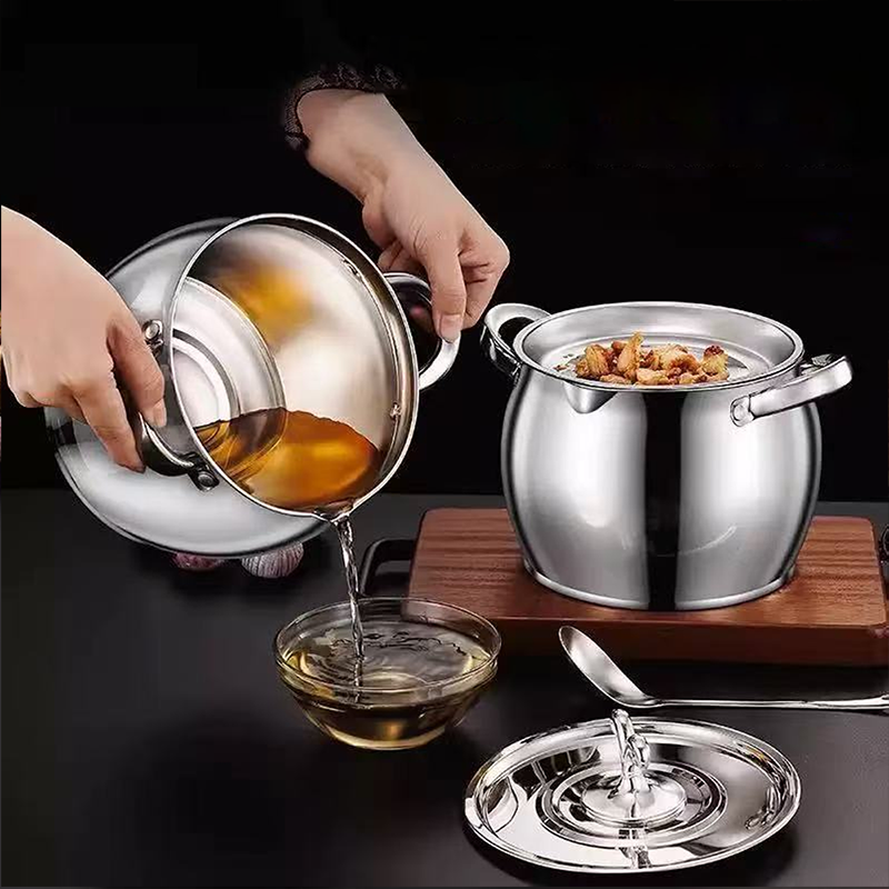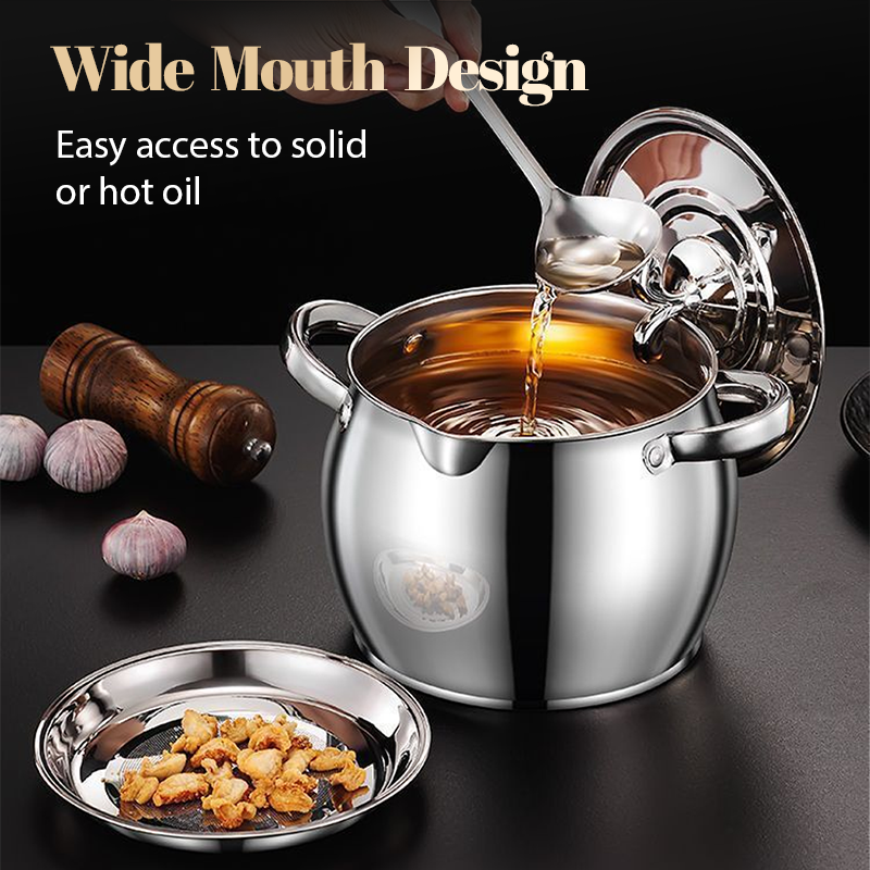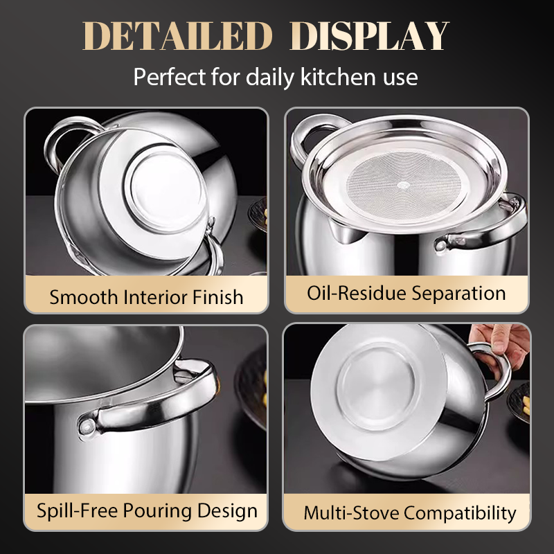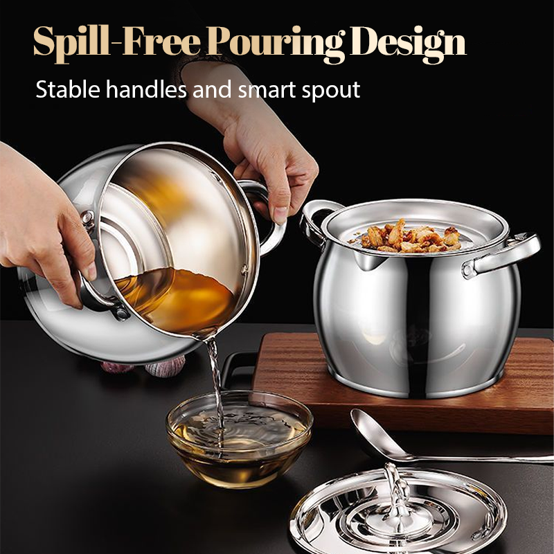 SZÉLES NYÍLÁS: A széles nyílás megkönnyíti a megszilárdult zsírhoz való hozzáférést és a forró olaj sima kiöntését. Nincs többé küszködés a keskeny nyílásokkal – tökéletes a mindennapi konyhai használatra, akár olajat tárol, akár levest tálal.