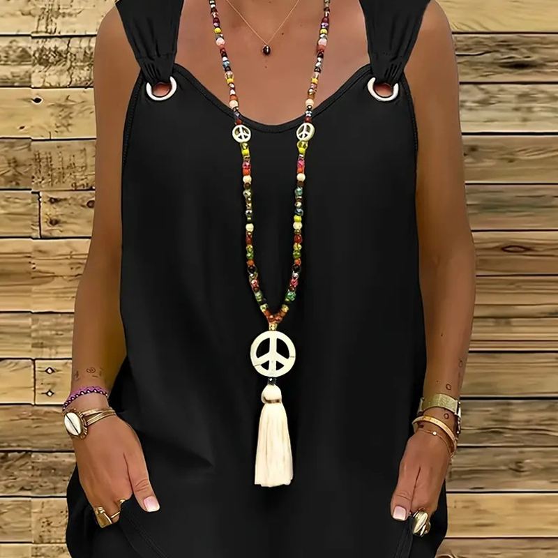 KARCSÚ UJJATLAN KIALAKÍTÁS VÁLLRÉSZLETEKKEL: Az ujjatlan felső kifinomult V-nyakkivágással és jellegzetes kerek vállkarikákkal rendelkezik, amelyek dimenziót és modern hangulatot kölcsönöznek. Ez az emelkedett részlet könnyedén átmenetet képez az alkalmi nappali viseletből az esti nyári eseményekre, sokoldalúságot kínálva divatos éllel.