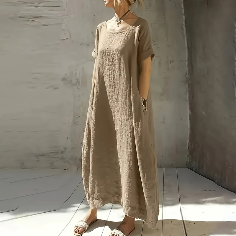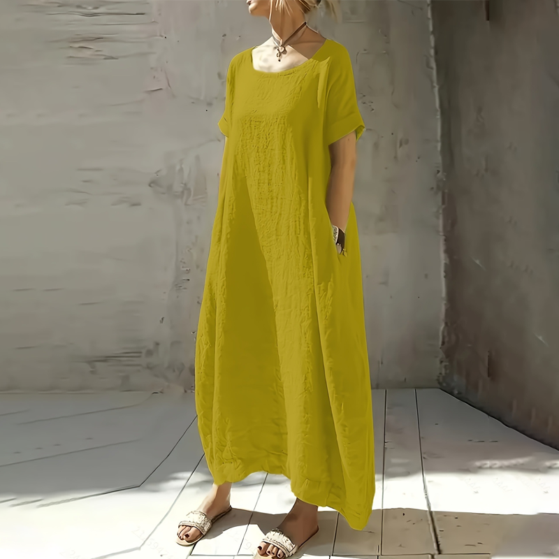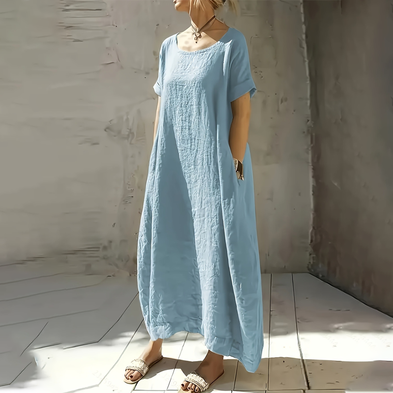 IDŐTLEN DESIGN: Klasszikus, rövid ujjú, kerek nyakú, egyszínű maxi ruha, amely elegáns és sokoldalú megjelenést biztosít. A minimalista designnak köszönhetően könnyen kombinálható kiegészítőkkel, így minden évszakban alapdarabja lehet a ruhatárnak.