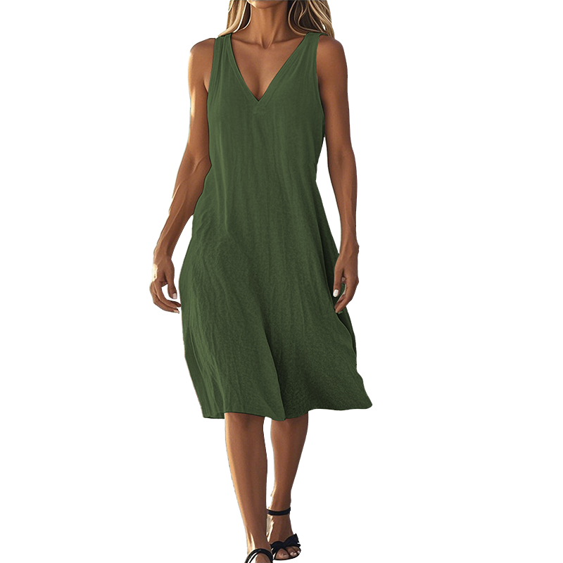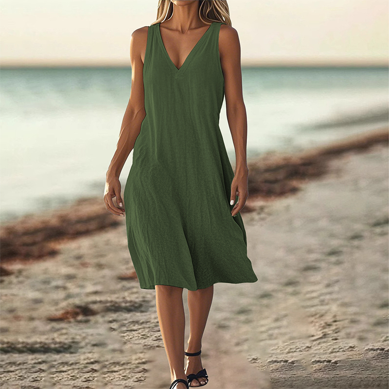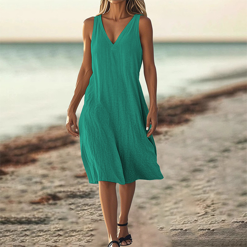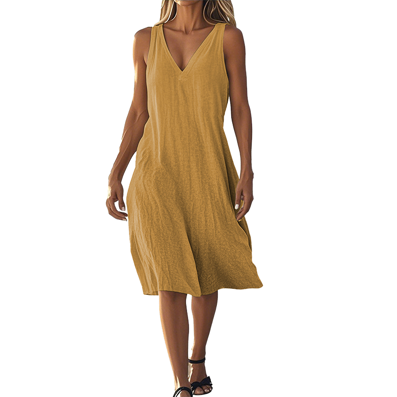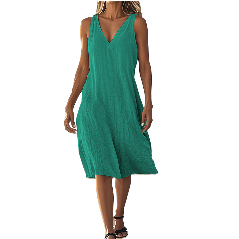 HÍZELGŐ V-NYAKÚ SZILUETT: Az ujjatlan, V-nyakú kialakítás elegáns és nőies megjelenést biztosít, miközben kényelmes viseletet biztosít. A nyakkivágás kiemeli a természetes alakot anélkül, hogy túlságosan feltáró lenne, így laza és kissé öltözködőbb alkalmakra egyaránt alkalmas. A laza szabás biztosítja a mozgásszabadságot és az egész napos kényelmet.