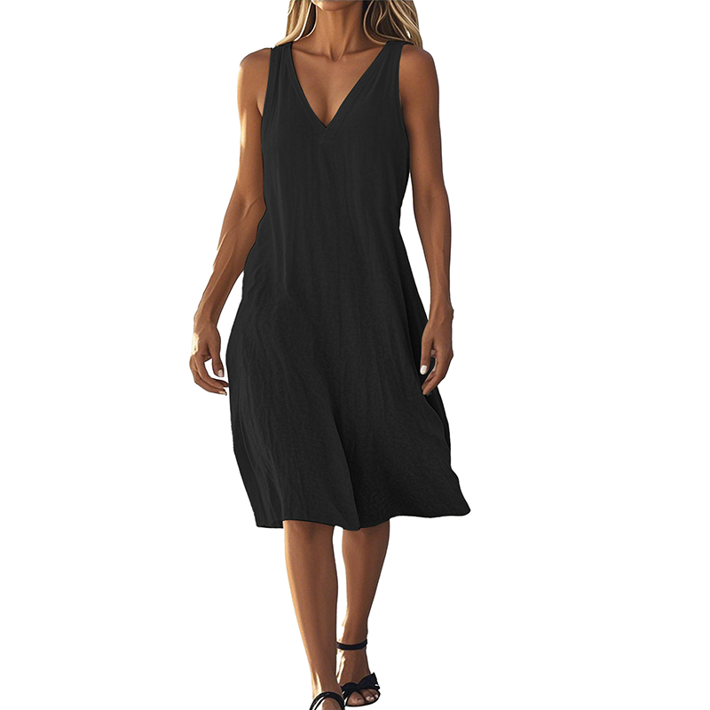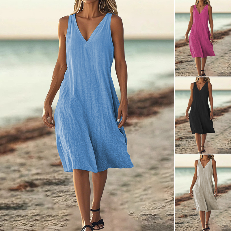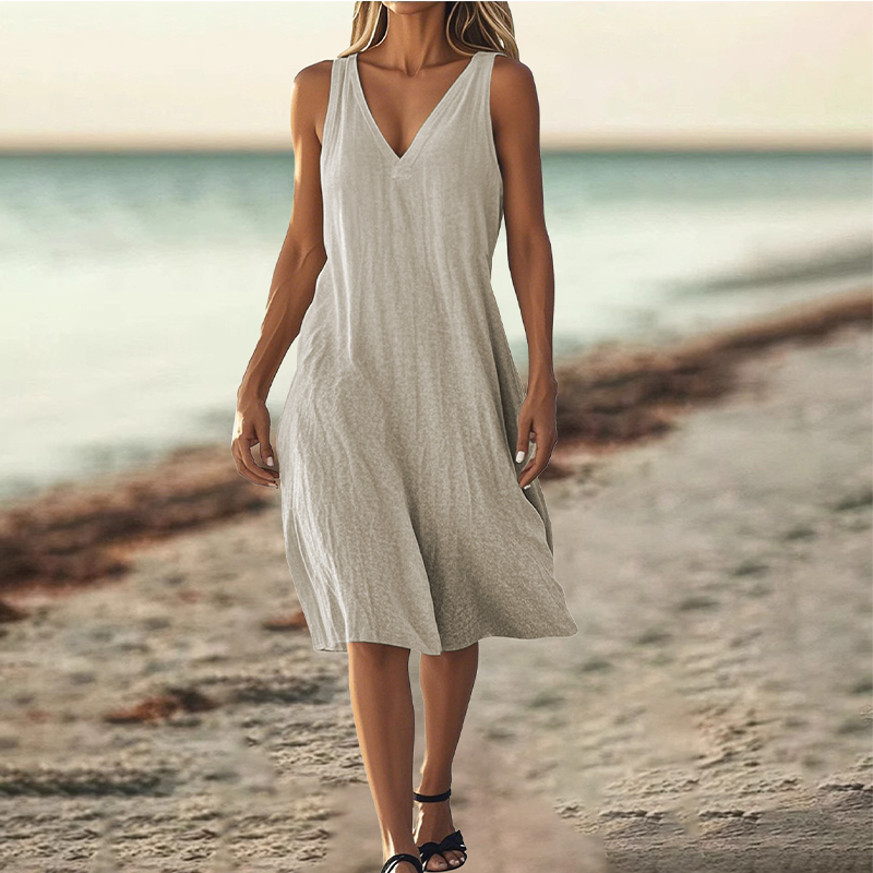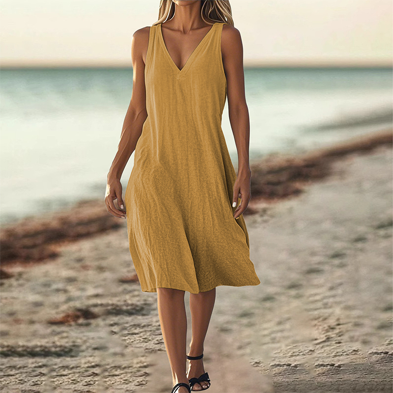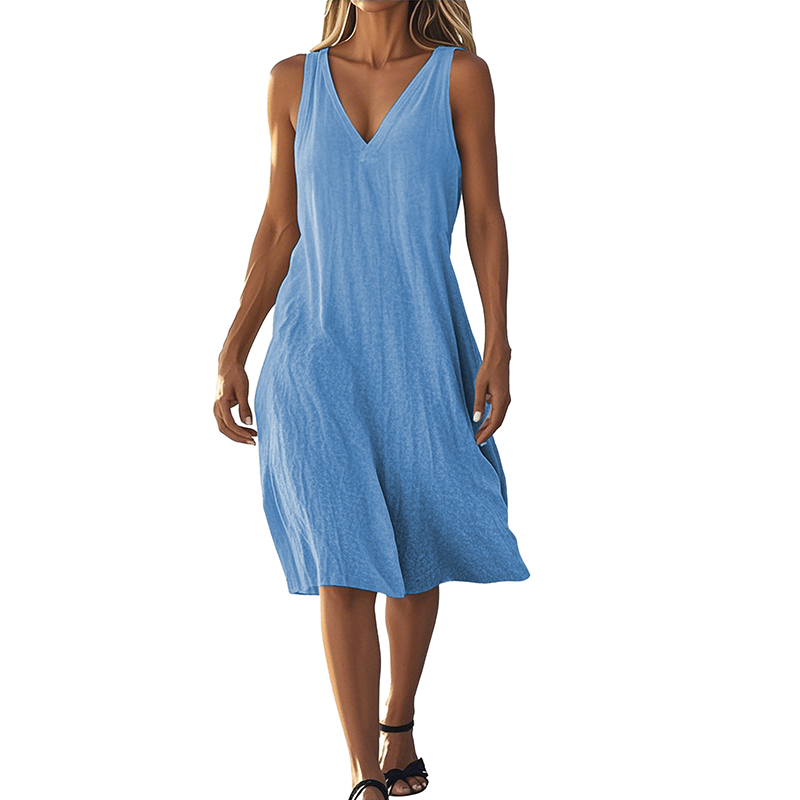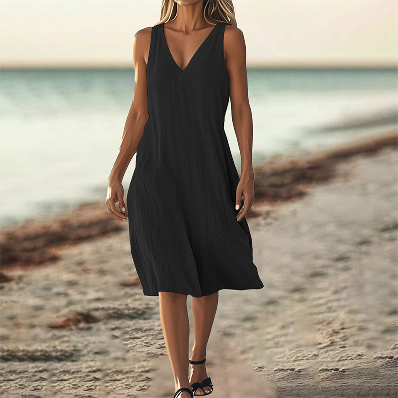 HÍZELGŐ V-NYAKÚ SZILUETT: Az ujjatlan, V-nyakú kialakítás elegáns és nőies megjelenést biztosít, miközben kényelmes viseletet biztosít. A nyakkivágás kiemeli a természetes alakot anélkül, hogy túlságosan feltáró lenne, így laza és kissé öltözködőbb alkalmakra egyaránt alkalmas. A laza szabás biztosítja a mozgásszabadságot és az egész napos kényelmet.