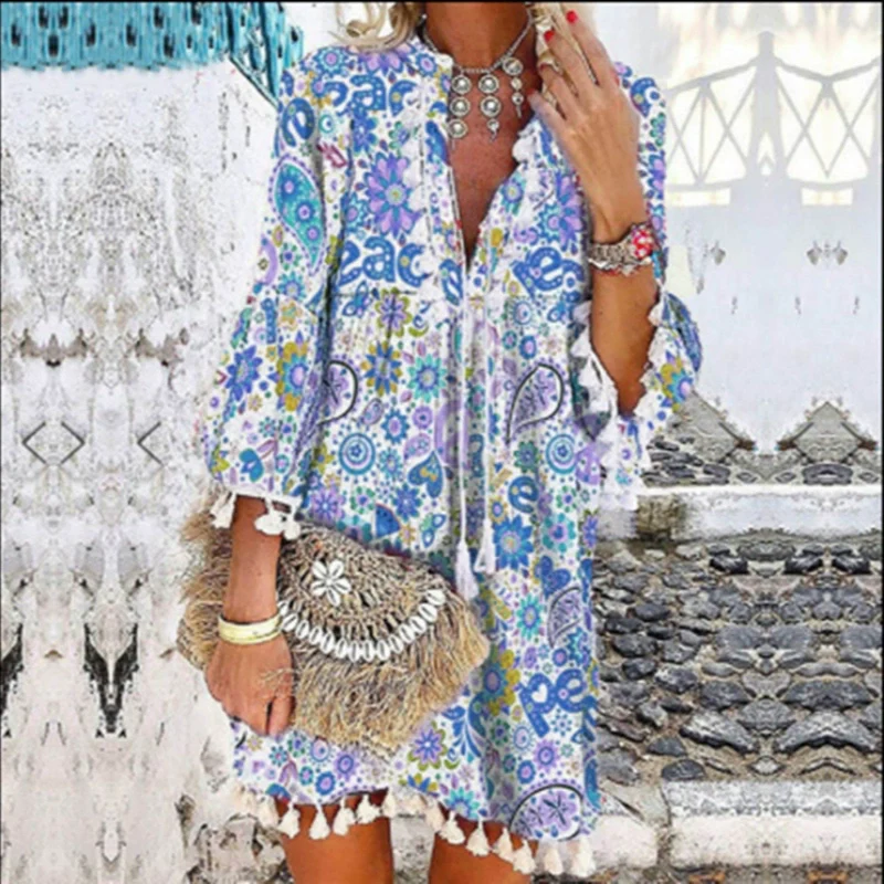 A csomag tartalma: 1*V-nyakú nyomtatott rojtos ruha 3/4 ujjal