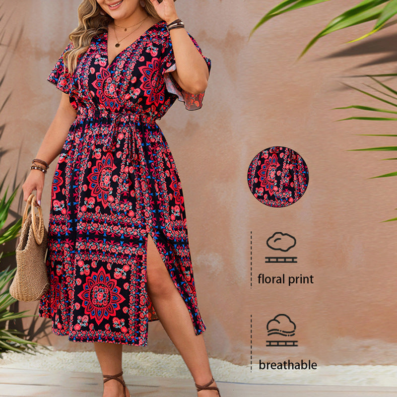 1 * Női alkalmi retro nyomtatott V-nyakú ruha