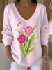 Női tulipán hímzett rózsaszín v-nyak pulóver