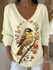 Női aranyos madár hímzett világos sárga v-nyak pulóver