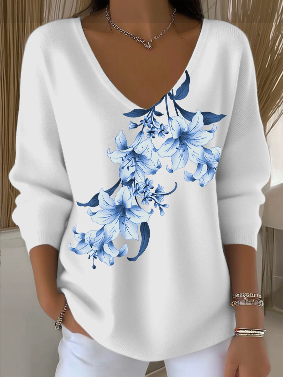 Női temperamentum kék nagy virág hímzett tiszta fehér v-nyak pulóver