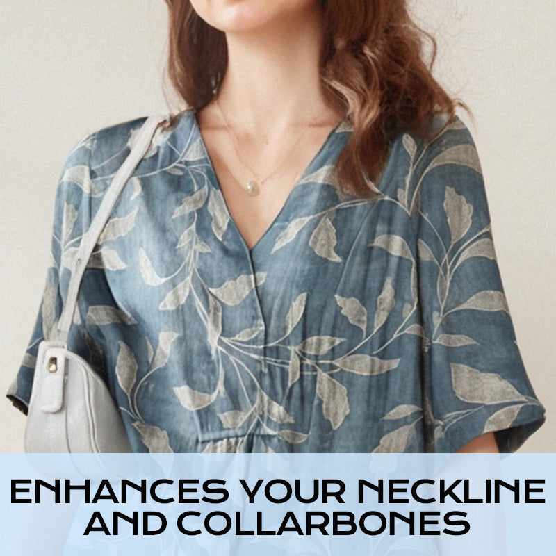 V-NYAKKIVÁGÁS – A V-nyakkivágás a nyakra irányítja a figyelmet, finoman kiemelve a kulcscsontokat a karcsúsító hatás érdekében. Tökéletes egyensúlyt teremt a bőr látszása és a ruha laza stílusának megőrzése között, friss és kifinomult hatást kölcsönözve az öltözékednek.