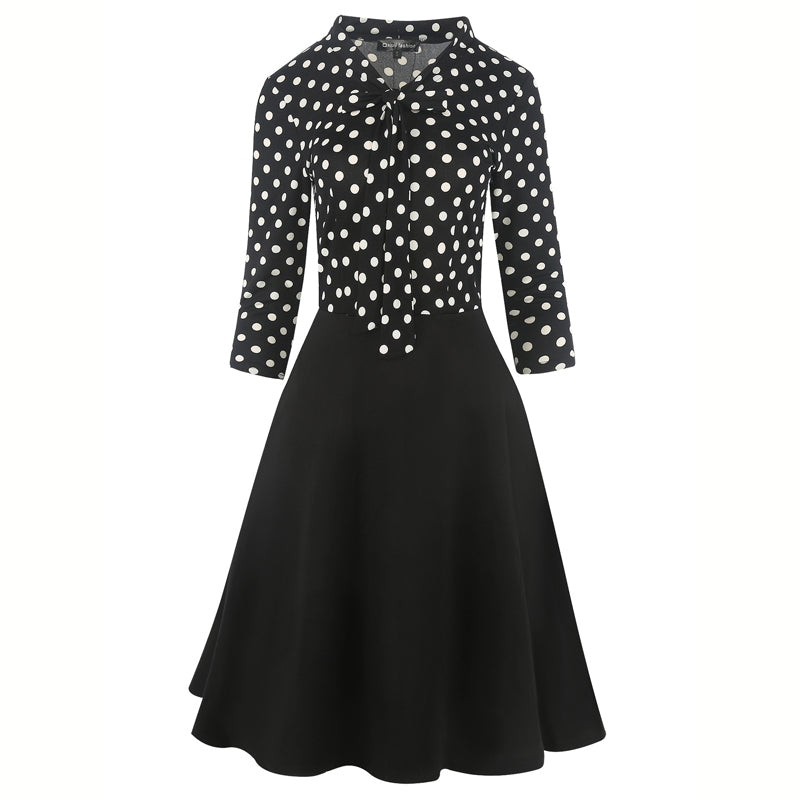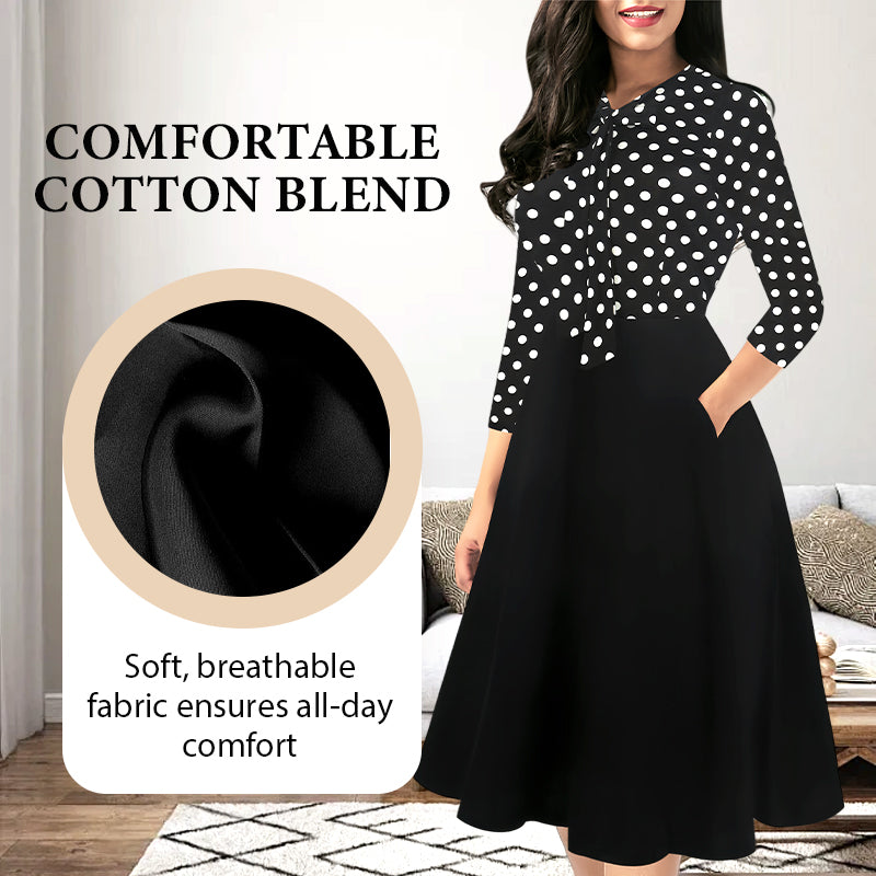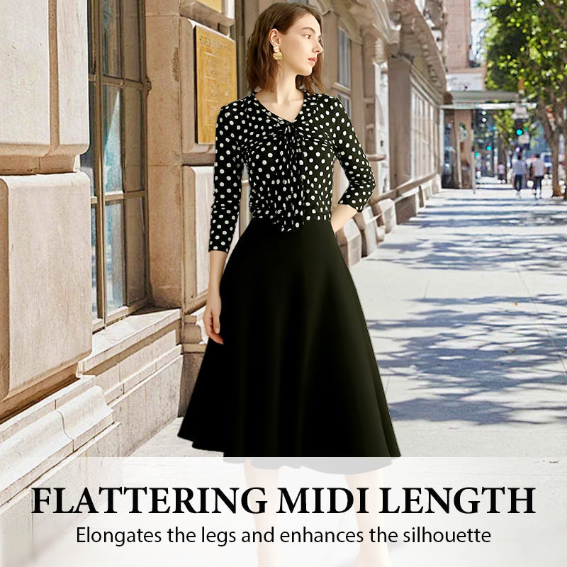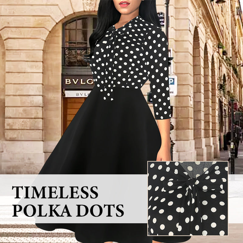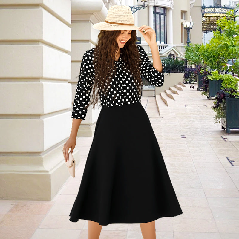 IDŐTLEN PÖTÖS MINTÁZAT – Az Elegant Polka Dot Midi ruha klasszikus pöttyös mintázattal rendelkezik, amely játékos, mégis kifinomult megjelenést kölcsönöz viselőjének. Ez a ruha továbbra is stílusos alapdarabja a ruhatárnak, amely soha nem megy ki a divatból.
