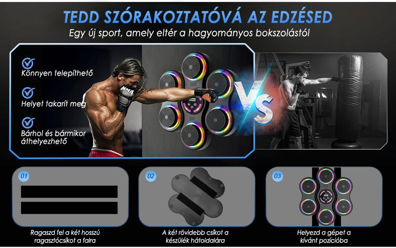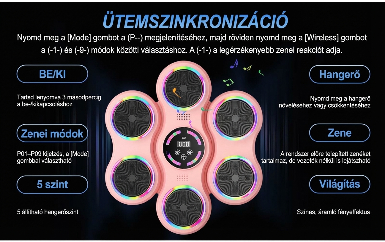 INTERAKTÍV RITMIKUS VILÁGÍTÁS – Élvezze a minden ütést kísérő, szinkronizált, ritmikus fények lenyűgöző látványát. Ezek a dinamikus vizuális jelzések javítják a kéz-szem koordinációt és a koncentrációt, így minden ütés hatékonyabbá és kielégítőbbé válik. A vibráló fények izgalmas, játékos elemet adnak minden edzéshez.